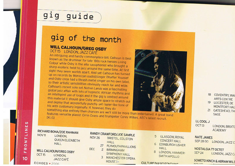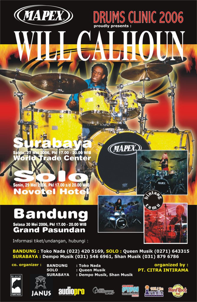 ![]() ![]() ![]() 2006 Archive Living Colour December, 2006 European Tour dates Tue 12/12/06 - Vienna, AUSTRIA @ Porgy Wed 12/13/06 - Bologna, ITALY @ Estragon Thu 12/14/06 - Bochum, GERMANY @ Bahnhof Langendreer Fri 12/15/06 - Tilburg, NETHERLANDS @ The Choice Sat 12/16/06 - Haarlem, NETHERLANDS @ Patronaat Sun 12/17/06 - Brussels, BELGIUM @ Ancienne Belgique Mon 12/18/06 - Prague, CZECH REPUBLIC @ Retro Music Hall As always, please make sure to check with the local venues to confirm show dates and details! Will Calhoun - Drumwave Tour Dates The Drumwave Tour is Will Calhoun's solo Electronic/Acoustic, Ambient/Visual Performance Tour. Expect to see and hear a wide range of the Calhoun arsenal in this mesmerizing performance, including an eclectic array of electronics, drums, and indigenous flutes, with arresting visuals. This is not a Drum Clinic tour with Q&A, etc; it is a full-on Performance Tour. Typical performances are two 45 minute sets, check listings for other specifics. Enjoy! Mon 12/04/06 - Berlin, GERMANY @ A-Trane Tue 12/05/06 - Hannover, GERMANY @ Enercity Expo Wed 12/06/06 - Halle, GERMANY @ Objekt 5 Thu 12/07/06 - Dresden, GERMANY @ Jazzclub Neue Tonne Fri 12/08/06 - Innsbruck, AUSTRIA @ Treibhaus Sat 12/09/06 - Enns, AUSTRIA @ Kulturzentrum Zuckerfabrik Sun 12/10/06 - Vienna, AUSTRIA @ Reigen As always, please make sure to check with the local venues to confirm show dates and details! November 18th, 2006 Will Calhoun's "Native Lands" late-night performance at the Blue Note in NYC Featuring: Will Calhoun: Bandleader, Drums, Loops, Indigenous Percussion Marcus Strickland: Tenor & Soprano Saxophones Orrin Evans: Piano, Keyboards Mark Kelley: Bass Corey Wilkes: Trumpet, Flugelhorn Click here for gig poster. Showtime is scheduled for 12:30am. Tix are $10. Part of the Late Night Groove Series. Blue Note 131 W 3rd St. NYC Visit the Blue Note Web site or call the box office at 212-475-8592 for additional details. Sept/Oct 2006 Europe Clinic Dates Click here for Sept. & Oct. 2006 clinic dates in Canada and Europe Saturday, October 14th, 2006 Will Calhoun's "Native Lands" performance at New Morning Jazz Club in PARIS, France. Performance 9 - 11pm (Two 60 minute sets). The Native Lands Band Will Calhoun: Drums, loops, indigenous percussion Greg Osby: Alto Sax Corey Wilkes: Trumpet Orrin Evans: Piano, Keyboard Mark Kelly: Bass New Morning address: 6 rue des Petites Ecuries, 75010 PARIS France Tel.#: 011 33 1 45 23 51 41 As always, please make sure to check with the local venues to confirm show dates and details! Sunday, October 15th, 2006 Will Calhoun's "Native Lands" performance at Jazz Cafe in LONDON, England. Doors 7pm. 2 Sets: 8:00pm & 10:0pm. The Native Lands Band Will Calhoun: Drums, loops, indigenous percussion Greg Osby: Alto Sax Corey Wilkes: Trumpet Orrin Evans: Piano, Keyboard Mark Kelly: Bass Jazz Cafe address: 5 Parkway, Camden Town, London NW1 7PG Tel#: 44 20 7485 6834 Click here for gig press As always, please make sure to check with the local venues to confirm show dates and details! Wednesday, October 18th, 2006 Will Calhoun's "Native Lands" performance at The CAT Club in BORDEAUX, France - Two 60 minute sets. The Native Lands Band Will Calhoun: Drums, loops, indigenous percussion Greg Osby: Alto Sax Corey Wilkes: Trumpet Orrin Evans: Piano, Keyboard Mark Kelly: Bass CAT Club address: 24 rue de la Faïencerie 33000 Bordeaux Phone: 05 53 39 87 74 Click here for clinic/gig flyer As always, please make sure to check with the local venues to confirm show dates and details! Monday, August 28th, 2006 Will performs at an event in Body English club at the Hard Rock Hotel in Las Vegas. Click here to view the event invite. Showtime is 10pm. Hard Rock Hotel 4455 Paradise Rd. Las Vegas, NV 89109 Living Colour August, 2006 European Tour dates (featuring Doug Pinnick of King's X on vocals) Thu 8/10/06 - Berlin, GERMANY @ Sage Club Fri 8/11/06 - Dresden, GERMANY @ Tante Ju Sat 8/12/06 - Amsterdam, NETHERLANDS @ Paradiso Sun 8/13/06 - Zoetermeer, NETHERLANDS @ Boerderij Tue 8/15/06 - Sziget, HUNGARY @ Festival Wed 8/16/06 - Vienna, AUSTRIA @ Reigen Thu 8/17/06 - Winterthur, SWITZERLAND @ Salzhaus Fri 8/18/06 - Hodokvas, SLOVAKIA @ Festival Sat 8/19/06 - Trutnov, CZECH REPUBLIC @ Festival Sun 8/20/06 - Dortmund, GERMANY @ Domizil As always, please make sure to check with the local venues to confirm show dates and details! Friday, August 4th, 2006 Will performs with the Michael Gregory Three at Tonic, featuring Michael Gregory on guitar, Will Calhoun on drums and Kermit Driscoll on bass. Showtime is 8pm. TONIC 107 Norfolk Street New York, NY 10002 tonic@tonicnyc.com Saturday, July 8th, 2006 Living Colour performs at the Bospop Festival in Weert (NL), at the Boshoven Sportspark. Friday, June 23rd, 2006 Will performs at "The Power of Drum! A Max Roach Celebration!" on Friday, June 23, 2006 in NYC. Click here for more details. Living Colour May 2006 Australia Tour dates Tue 5/16/06 - Melbourne, Australia @ The Metro Nightclub Wed 5/17/06 - Melbourne, Australia @ The Metro Nightclub Thu 5/18/06 - Melbourne, Australia @ The Metro Nightclub Sat 5/20/06 - Sydney, Australia @ The Roxy Tickets on sale with all Ticketmaster agents and at ticketmaster.com.au As always, please make sure to check with the local venues to confirm show dates and details! Saturday, May 6, 2006 Will performs at the London Guitar show with Doug Wimbish and Skip McDonald Saturday, April 29th, 2006 Will Calhoun will be the featured International Star Guest at the Cegléd Drummers' Festival, an annual international drum and percussion festival in Hungary. Venue = Sport Hall Cegléd. Performance is scheduled for 9:30pm. Sunday, April 30th, 2006 Will Calhoun will hold a drum clinic in Budapest, Hungary. Clinic begins at 5pm. Venue: Dozsa Gyorgy Muvelodesi Haz H-1173 Budapest, Pesti ut 113. As always, please make sure to check with the local venues to confirm show dates and details! Saturday, April 15th, 2006 Will performs 