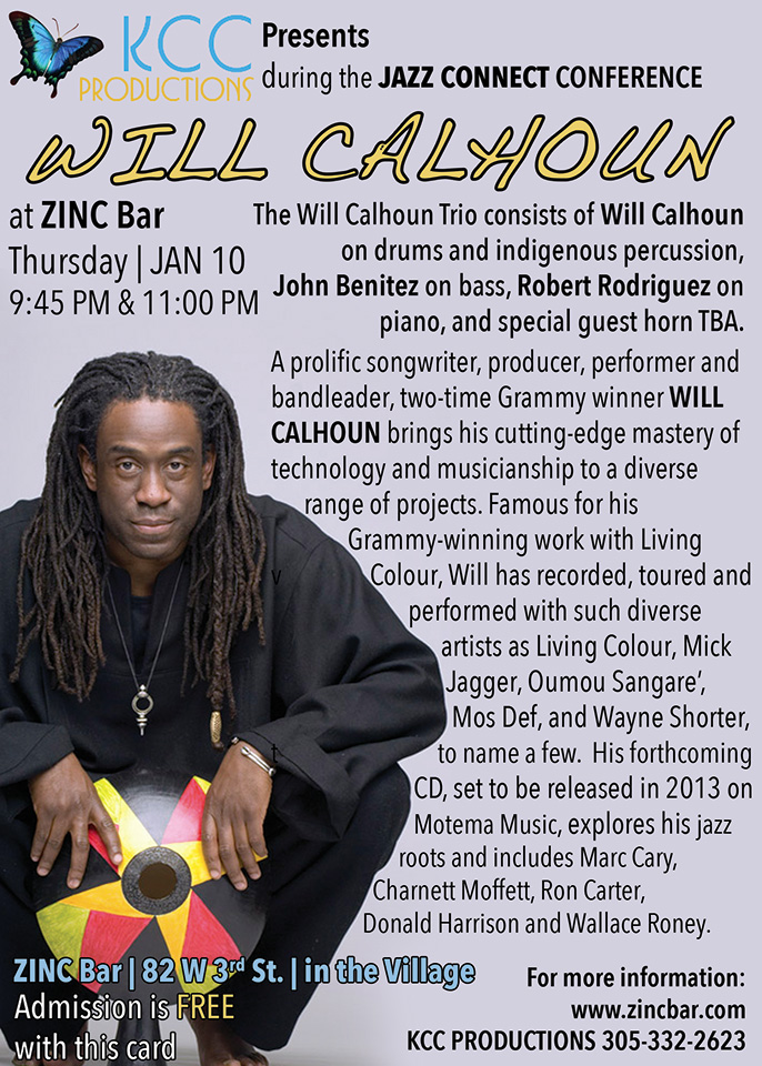 Will Calhoun's Native Lands Trio at Brooklyn Academy of Music Performance begins at 11:00pm Free Featuring: Brooklyn Academy of Music Check out the BAM Website for additional details and to confirm times. Monday, January 21, 2013 Million Man Mosh II: A Benefit for Donovan Drayton,' ft. Living Colour, 24-7 Spyz, Ronny Drayton + more The Black Rock Coalition proudly presents' The Million Man Mosh II: A Benefit for Donovan Drayton' at The Highline Ballroom in New York City. The show will reunite two of the city's most renowned Black rock bands in a rare joint stage appearance: Grammy-Award winning rock band Living Colour and funk-metal-soul pioneers 24-7 Spyz. Legendary guitarist Ronny Drayton will perform with an all-star cast of musicians. Proceeds for the event will go to the legal defense of Donovan Drayton, son of Ronny, who was recently released on bail after serving five years in Riker's Island without a conviction. Doors open at 6PM, show time is at 7PM Tickets are $35 advance, $40 day of show, $50 VIP seating and backstage meet and greet. Highline Ballroom Check out the Highline Ballroom Website or call (212) 414-5994 for additional details and to confirm times. Saturday, January 19th, 2013 Will with Doug Wimbish at WimBash>>Miami Beach 2013 Will performs with the Doug Wimbish Sound System as part of WimBash>>Miami Beach 2013, hosted by Art Deco Weekend/Miami Design Preservation League. Performance begins at 10pm 11th Street Stage Check out the Art Deco Weekend Festival and Doug Wimbish Facebook calendar pages for more information. Friday, January 11th, 2013 Will Calhoun's E=MC2 trio at The Bitter End As part of the 2013 NYC Winter Jazzfest, Will Calhoun's E=MC2 trio will play at The Bitter End. Performance begins at 12:30am (early morning on Saturday, January 12) Featuring: The Bitter End Check out The Bitter End Website or call (212) 673-7030 for additional details and to confirm times. Friday, January 11th, 2013 Will performs at Le Poisson Rouge for 2013 NYC Winter Jazzfest Performance begins at 11pm Le Poisson Rouge Check out the Le Poisson Rouge Website or call (212) 505-3474 for additional details and to confirm times. Friday, January 11th, 2013 Will performs with Global Noize in Sly Reimagined, the music of Sly and the Family Stone Doors open at 9pm, show begins at 9:30pm Drom Check out the Drom Website or call (212) 777-1157 for additional details and to confirm times. Will Calhoun's Native Lands Trio at Zinc Bar The Will Calhoun Trio plays at the Zinc Bar as part of the 2013 NYC Winter Jazzfest and Jazz Connect Conference Set times are 9:45 and 11:00pm Cover is $15, free for attendees at the Jazz Connect Conference Featuring: Zinc Bar Check out the Zinc Bar Website or call (212) 477-9462 for additional details and to confirm times. Private Drum Lessons with Will Calhoun
